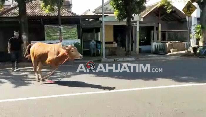 Lumajang, ArahJatim.com – Sebuah peristiwa unik terjadi di Masjid Darul Falah, Kelurahan Kepuharjo, Lumajang, Rabu (21/7/2021) pagi. Seekor hewan kurban jenis sapi ras madura terlepas ke jalan raya saat akan disembelih di halaman masjid tersebut. Beruntung, panitia kurban yang dibantu warga berhasil menangkap sapi itu hingga akhirnya disembelih.