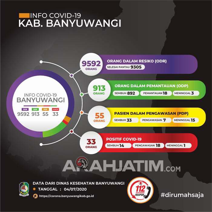 Dalam kesempatan itu, Gugus Tugas Covid-19 Banyuwangi juga mengumumkan ada tambahan empat kasus positif di Banyuwangi, yaitu pasien nomor 30, 31, 32 dan 33. Sehingga saat ini jumlah positif Covid-19 Banyuwangi menjadi 33 kasus.