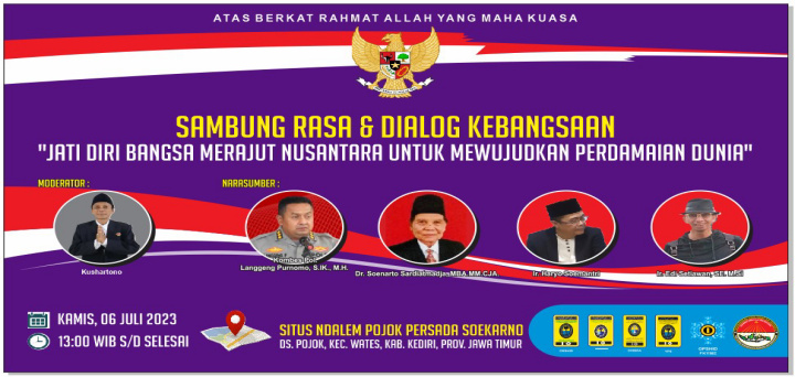 Kediri, ArahJatim.com – Seiring dengan kegiatan peletakan batu pertama pembangunan Pesantren Jatidiri Bangsa Indonesia (PJDBI) di Situs Bung Karno Ndalem Pojok Kediri pada 06 Juli 2023 / 17 Dhulqo’dah 1444 H akan gelar Diskusi Kebangsaaan Jatidiri Bangsa Merajut Nusantara Menuju Perdamaian Dunia. Acara bakal dilangsungkan siang jam 13.00 WIB di Sanggar Sasono Pandji Saputro Situs Ndalem Pojok.