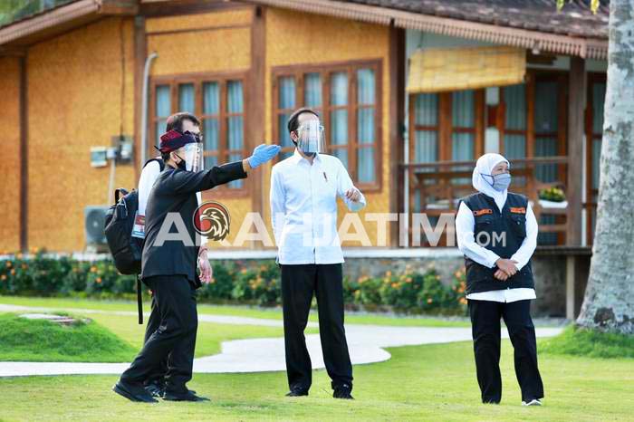 Jokowi didampingi Menko Polhukam Mahfud MD, Sekretaris Kabinet Pramono Anung, Menkes Terawan Agus Putranto, Menteri Pariwisata dan Ekonomi Kreatif Wishnutama, Ketua Gugus Tugas Percepatan Penanganan Covid-19 Doni Monardo, Gubernur Jatim Khofifah Indar Parawansa, Pangdam V/Brawijaya Mayjen Widodo Iryansyah, dan Kapolda Jatim Irjen Fadil Imran.