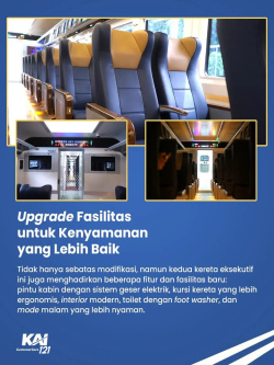 Zainul menambahkan, tidak hanya sebatas pengembangan, tetapi kedua kereta eksekutif ini juga menghadirkan beberapa fitur dan fasilitas baru, seperti pintu kabin dengan sistem geser elektrik, kursi kereta yang lebih ergonomis, interior modern, toilet dengan foot washer, serta mode malam yang lebih nyaman.