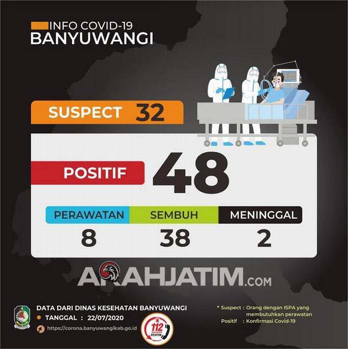 Banyuwangi, ArahJatim.com – Gugus Tugas Percepatan Penanganan Covid-19 Banyuwangi mengumumkan kembali penambahan kasus konfirmasi Covid-19. Pada hari ini, Rabu (22/7/2020) ada penambahan dua pasien Covid-19 Banyuwangi.
