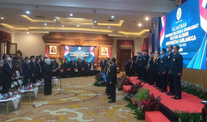 Surabaya, ArahJatim.com – Ketua Umum Pengurus Pusat Ikatan Alumni Universitas Airlangga (PP Ika Unair) Khofifah Indar Parawansa melantik 5 pengurus wilayah (Pengwil) dan 10 komisariat fakultas, masa bakti 2021-2025. Pelantikan dihelat di Gedung Negara Grahadi, Surabaya, Sabtu, 16 April 2022, malam.