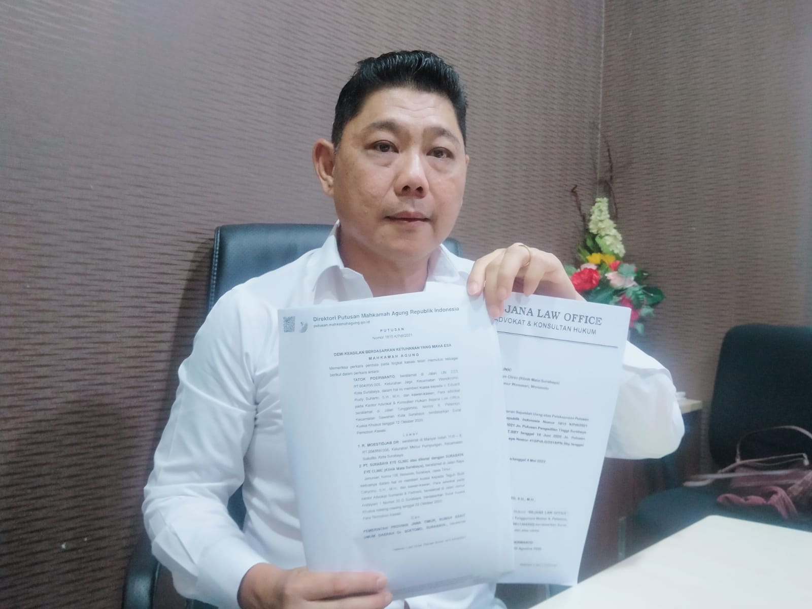 Sementara itu, saat dikonfirmasi, penasihat hukum Direktur PT Surabaya Eye Clinic, Dokter Moestijab, Soemarsono mengatakan jika kliennya sampai saat ini sudah berupaya untuk menjalankan putusan kasasi Mahkamah Agung RI itu. Namun permasalahannya angka ganti rugi yang ia tawarkan bersama kliennya belum disepakati Tatok Poerwanto. “Sampai saat ini belum disetujui dan saya masih menunggu,” kata Soemarsono.