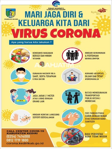 Imbauan dimulai dari mengkonsumsi makan  bergizi dan minuman serta menambah vitamin, gunakan masker bila sakit serta terapkan etika jika batuk dan menjaga jarak 1 meter atau lebih dengan orang lain adalah salah satu upaya untuk menangkal penularan virus corona yang saat ini telah mewabah di berbagai daerah ditanah air termasuk di kabupaten Kediri.
