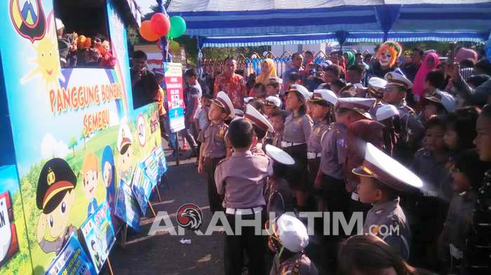 Para pengunjung area Monumen Arek Lancor terutama siswa-siswi TK dan PAUD Kemala Bhayangkari dan anak-anak usia dini lainnya tampak sangat antusias menikmati pertunjukan Panggung Boneka yang bertemakan “Pentingnya Kesadaran Dalam Berlalu Lintas”.