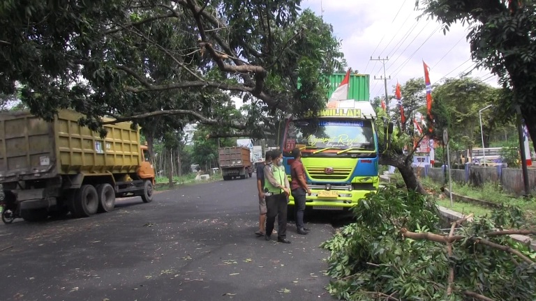 Akibat pohon tumbang ini, truk trailer yang dikemudikan Dwi ini mengalami kerusakan di bagian kanopi depan, dan bagian knalpot kendaran yang menjulang ke atas. “Yang rusak bagian atas itu, kalau saya dan kernet alhamdulillah tidak apa-apa,” tambahnya.