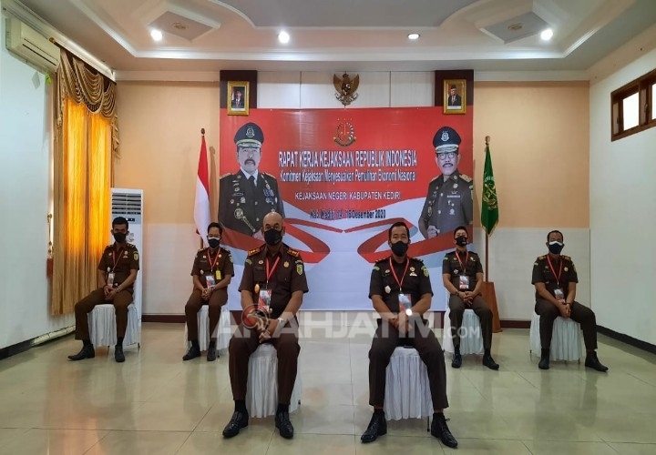 Kejaksaan Negeri Kabupaten Kediri yang dihadiri oleh Kepala Kejaksaan Negeri Kabupaten Kediri Sri Kuncoro, S.H., M.H. beserta para Kasi menghadiri kegiatan tersebut secara virtual/daring melalui saran video converensi yang langsung terhubung dengan penyelenggaraan kegiatan tersebut dengan tetap mematuhi protokol kesehatan.(das)