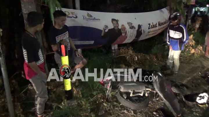 Kecelakaan menyebabkan kondisi sepeda motor Vario nopol P 6195 ZJ rusak parah. Pengendara meninggal dunia bernama Baruna 20 tahun, Kamis (23/05/2019) malam. (Foto: ArahJatim.com/ful)