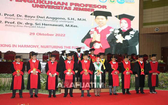 Jember, ArahJatim.com – Universitas Jember (UNEJ) kembali menggelar upacara pengukuhan guru besar di Gedung Auditorium Universitas Jember, Sabtu 29 Oktober 2022.